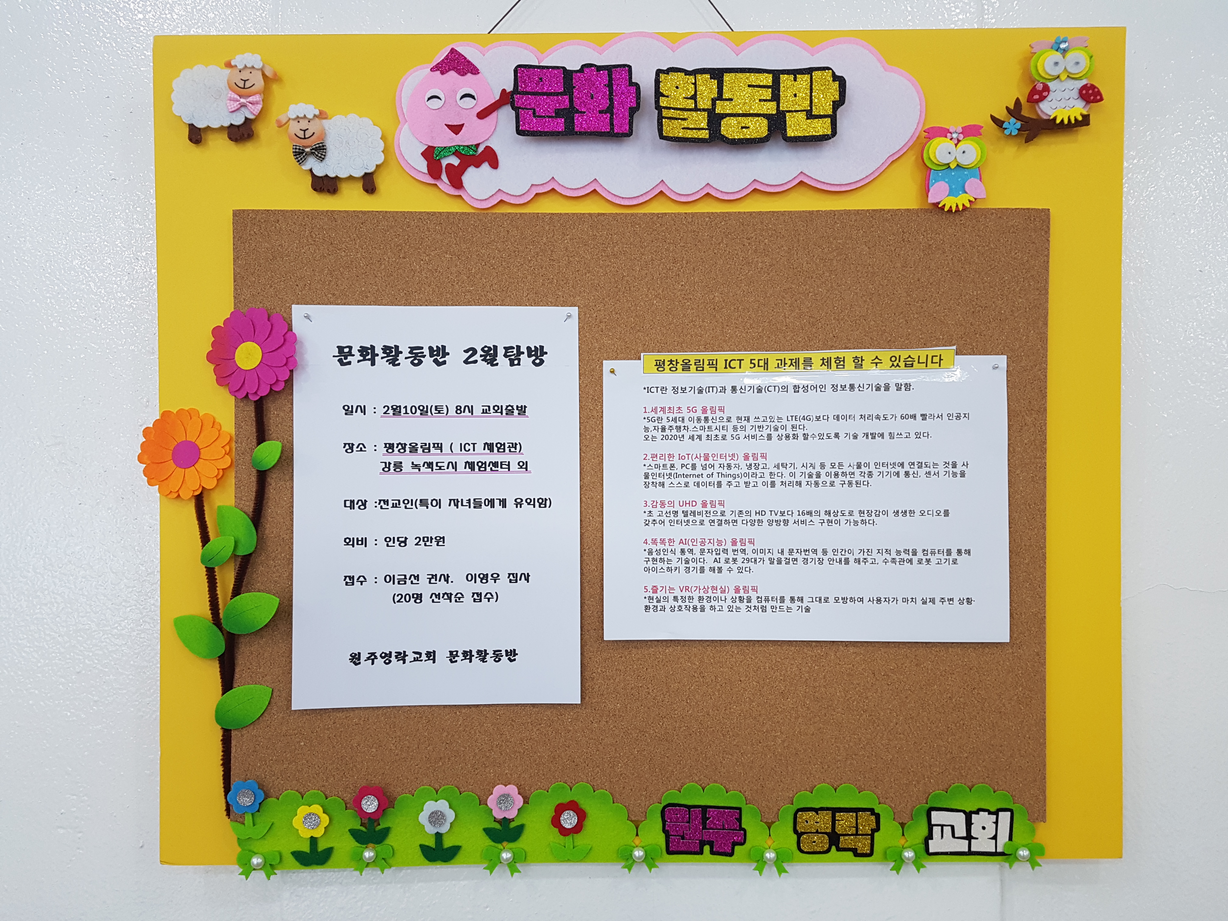 -2¿ù 10ÀÏ(Åä) 8½Ã ±³È¸Ãâ¹ß-Çà»ç ¿¹»ó ÀÏÁ¤ *10½Ã-12½Ã Æòâ¿Ã¸²ÇÈ ÇöóÀÚ ICT üÇè°ü üÇè *12½Ã-12:30 °¸ªÀ̵¿ *12:30 - 13:30 Á¡½É(ÃÊ´ç¼øµÎºÎ) *14:00 - 15:30 ³ì»öµµ½Ã üÇè¼¾ÅÍ *15:30 - 17:30 ±³È¸µµÂø *Æò»ý¿¡ Çѹø º¼ ¼ö ÀÖ´Â ¼¼°èÀÎÀÇ ÃàÁ¦¿¡ ±Û·Î¹úÇÑ ºÐÀ§±âµµ ´À²¸º¸°í, ´ëÇѹα¹ÀÌ ÃÖÃÊ·Î ¼±º¸À̴ ûº¸Åë½Å±â¼úÀ» Á÷Á¢ üÇè ÇØº¸°í, ¹Ì·¡ÀÇ ³ì»ö µµ½Ãµµ °æÇèÇØ º¼ ¼ö ÀÖ´Â Æòâ¿Ã¸²ÇÈ¿¡ ¿µ¶ô±³È¸ ¼ºµµ´ÔµéÀ» ÃÊûÇÕ´Ï´Ù.-- ¼¼ºÎ ³»¿ë ¾Æ·¡ ÷ºÎÆÄÀÏ ÂüÁ¶ -